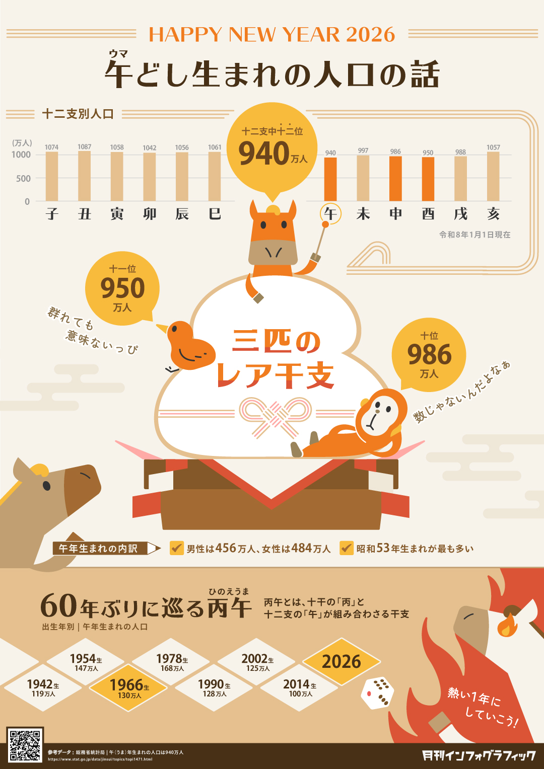 午年生まれの人口に着目し、あわせて本年60年ぶりに巡る丙午について紹介します。 本年も月刊インフォグラフィックを、何とぞよろしくお願いいたします。 Art direction / Design / illustration / Animation : Ozawa Takuya