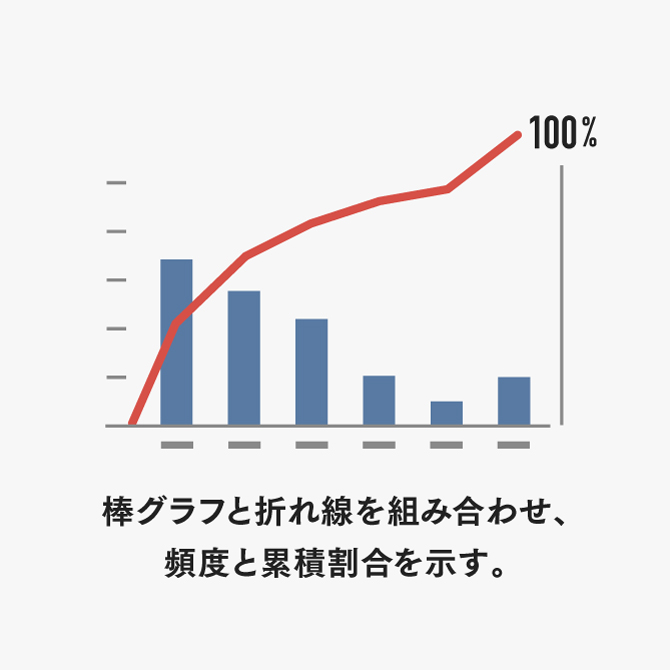 特徴:棒グラフと折れ線を組み合わせ、各要因の頻度と累積割合を同時に示す。
