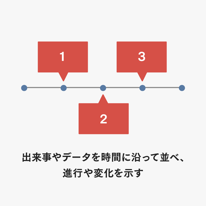 特徴:出来事やデータを時間の順序に沿って並べ、進行や変化を示すフレーム。水平や垂直の一本の軸に沿って情報を配置するのが基本。