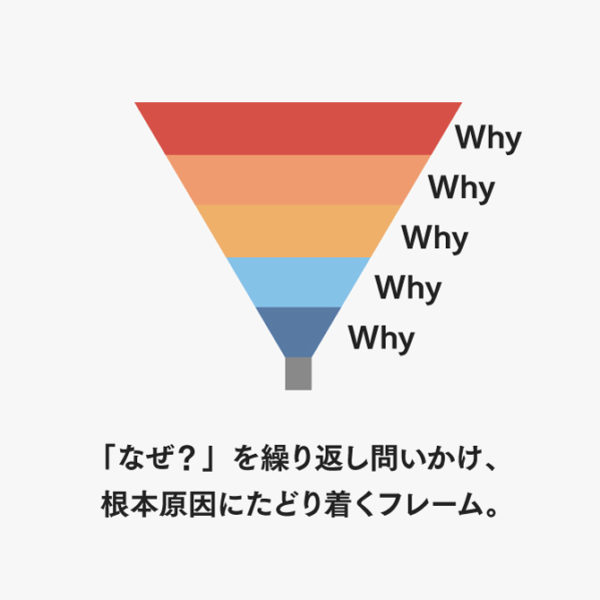 特徴:課題(結果)を魚の頭に置き、背骨から枝を伸ばす形で要因を分類して整理するフレーム。品質管理の現場でよく使われ、「フィッシュボーン図」とも呼ばれる。