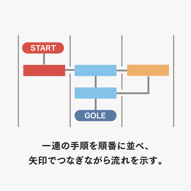 効果:複雑な作業を「どこから始まり、どこで終わるか」を明確にできる。役割や担当が異なる場合でも、流れを共通理解しやすくなる。