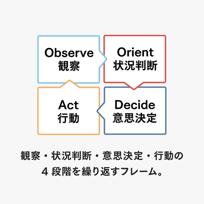 特徴:Observe(観察)・Orient(状況判断)・Decide(意思決定)・Act(行動)の4段階を繰り返すことで、変化に素早く対応するフレーム。