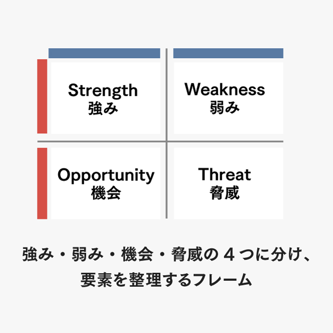 特徴:trength(強み)、Weakness(弱み)、Opportunity(機会)、Threat(脅威)の4つに分け、要素を整理するフレーム。4象限のマトリクス形式で表すのが一般的。