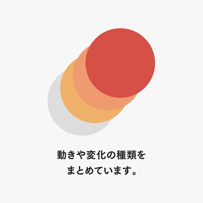 加速する/減速する/等速で進む/急停止する/断続的に動く(パルス)/リズムを刻む(ビート)/スローモーション化する/タイムラプス化する/遅延する(ラグ)/イーズイン/イーズアウト/一時停止する/ループする/ピンポン(往復)する