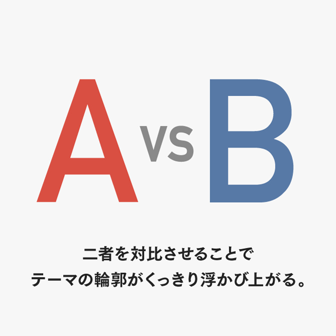 二項を並べて比較することで「違い」を一目で理解できる。賛成と反対、若年層と高齢層、テレビとネットなど、二者を対比させることでテーマの輪郭がくっきり浮かび上がる。