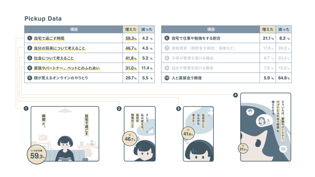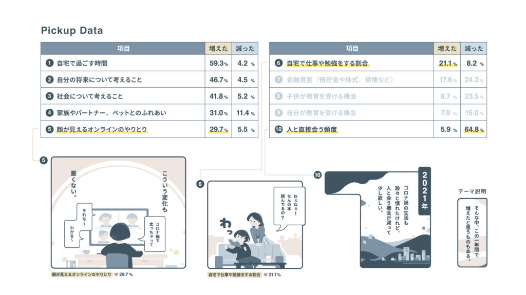 また、最も「減った」と回答された設問についても、数値は用いず、ストーリーの一部として自然に組み込んでいます。