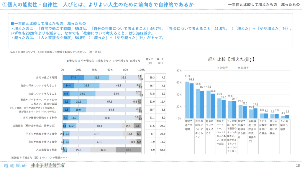 2020年と2021年を比較して、生活の中で増えたものと減ったものの調査結果を参照。